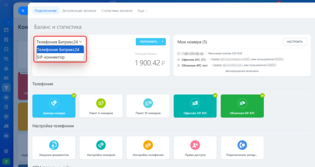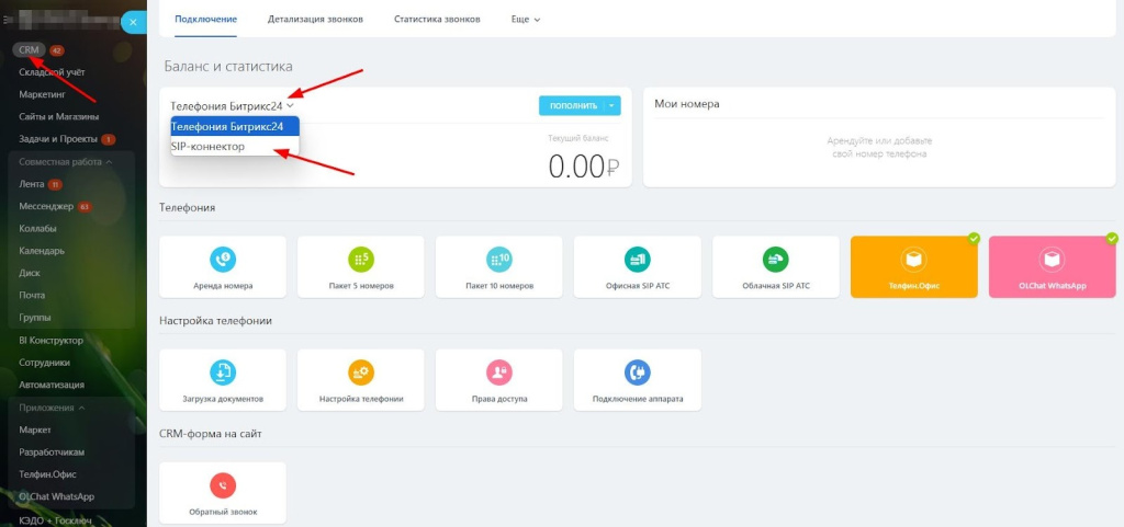 В разделе «Интеграции» выберите пункт «Телефония», вы попадете на вкладку «Подключение», там увидите название «Баланс и статистика», выберите ниже «SIP-коннектор».