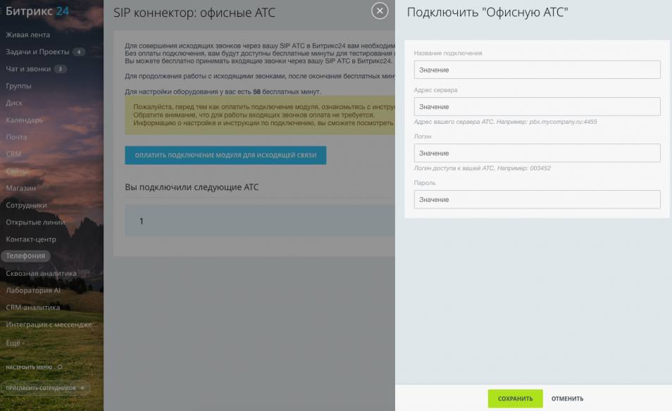 Если вы проверили в течение отведенных для этого 60 минут, как работает ваша интегрированная телефония, и результаты проверки вас устроили, для дальнейшей работы нужно будет произвести оплату подключения. После оплаты к модулю можно подключать несколько АТС, доплачивать не придется.