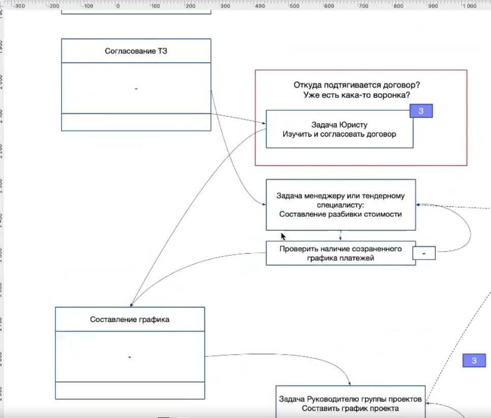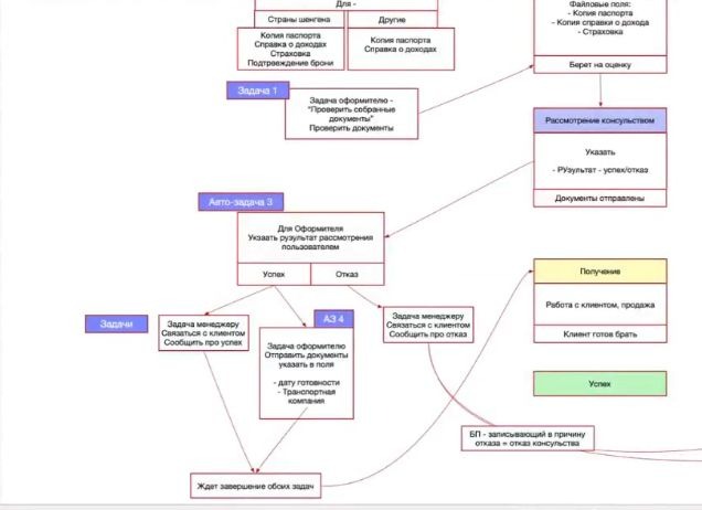 Перед началом разработки команда подготовила прототип карточки и блок-схему воронок. На ней отразили весь путь сделки — от загрузки договора до актирования, с автоматическими задачами, уведомлениями и назначением ответственных. После того как заказчик утвердил порядок переходов и последовательность этапов, специалисты перешли к верстке интерфейсов и настройке автоматизаций.