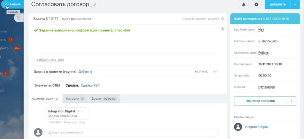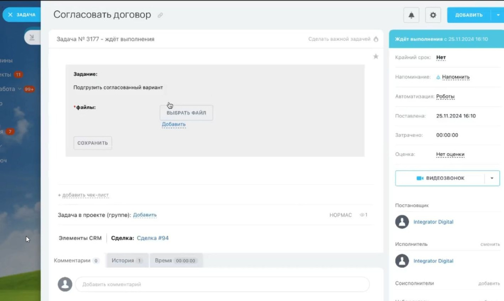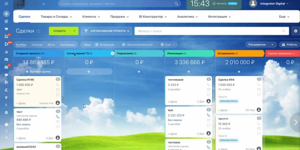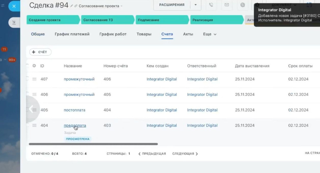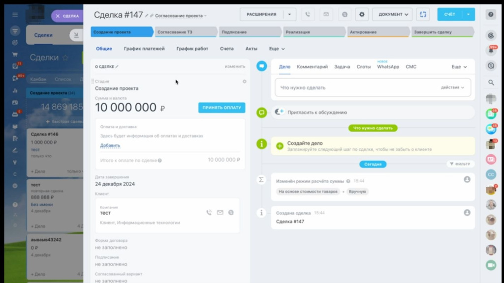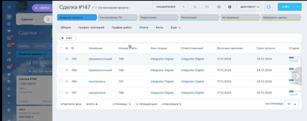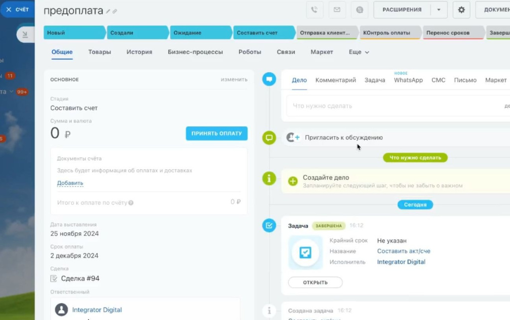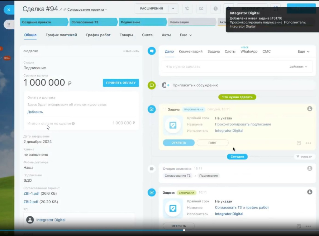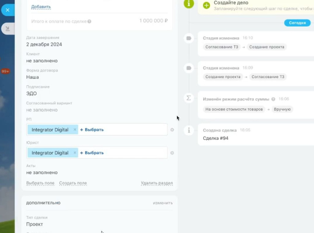 После настройки основной карточки сделки специалисты Integrator.Digital доработали внутренние инструменты, связывающие договор, платежи и документы в единую систему.
