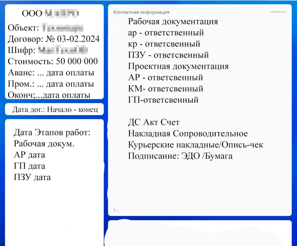 Архитектурное бюро ведет десятки параллельных проектов — от жилых комплексов до производственных объектов. Каждый включает договоры, приложения, накладные, календарные графики и множество этапов. Документы и таблицы хранятся в разных местах, а согласования идут в переписках и чатах. Со временем становится трудно понять, какая версия договора актуальна и кто отвечает за очередной шаг.