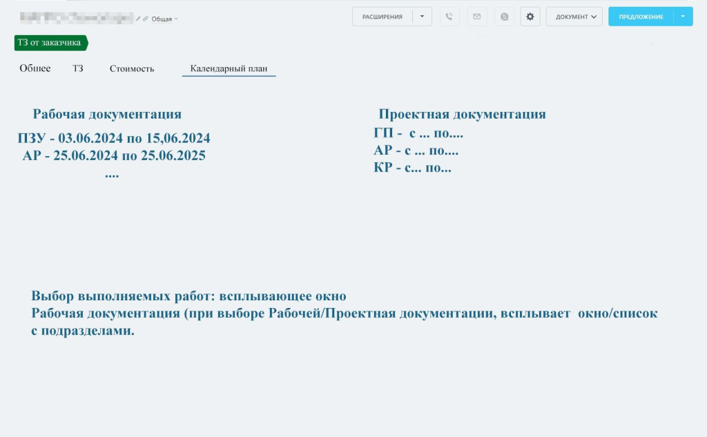Отдельным пунктом заказчик указал, какие разделы должны появиться в сделке: «Общее», «ТЗ», «Стоимость», «Календарный план», «Согласование» и «Подписание». Каждая вкладка отвечала за свой участок — от загрузки договора и приложений до формирования итоговой карточки проекта с финансовыми данными и календарем. Именно на этой структуре строилось дальнейшее решение: система должна была повторять логику проектного цикла, а не привычную воронку продаж.