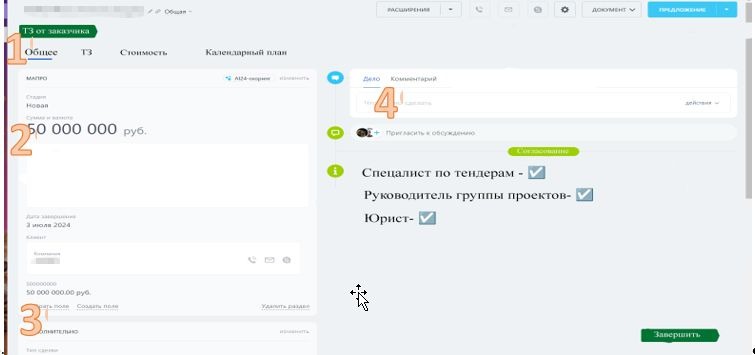Вкладка «Общее». В ней собраны ключевые данные: стоимость, сроки, перечень работ, сведения о заказчике и ответственных. Здесь же добавлено окно для переписки и отметки согласующих — юрист, тендерный специалист и руководитель проекта утверждают документ, после чего сделка автоматически переходит на следующий этап.
